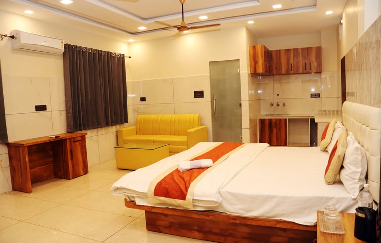 Our hotel features clean and spacious AC rooms, deluxe rooms, and essential facilities like Free Wi-Fi, Parking, Laundry, Breakfast availability, a Geyser, Air Conditioning and a TV in every room.
